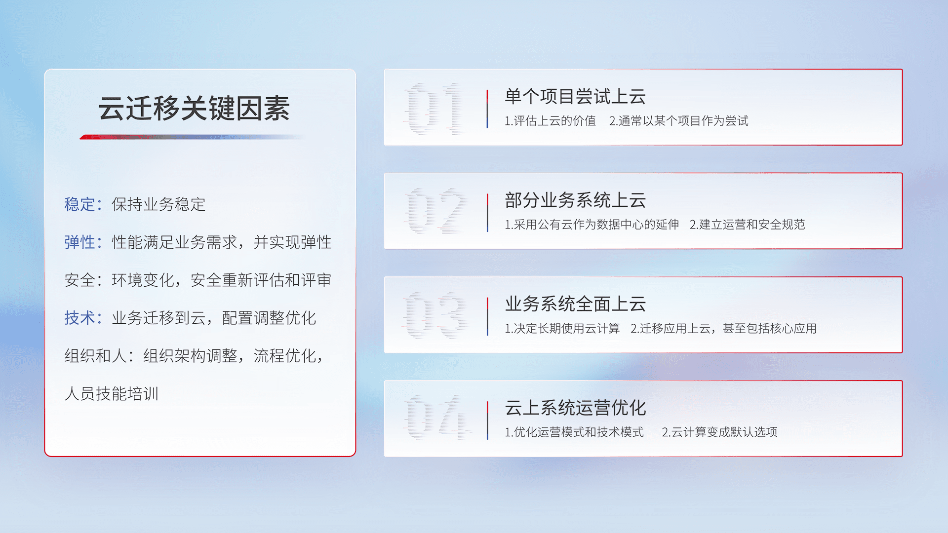 结合实际业务,,从规划设计、、、云平台选型、、云原生改造、、数据迁移、、集成交付,,迁移全过程为客户识别最佳上云路径,,做好风险识别管理,,,,设计网络架构、、、、身份权限、、安全审计合规、、操作审计、、日志审计、、、监控告警策略、、、多站点容灾设计等,,,对云上基础设施进行整体规划,,,提升IT治理水平,,,以满足弹性、、高可用、、高性能的需求。。。