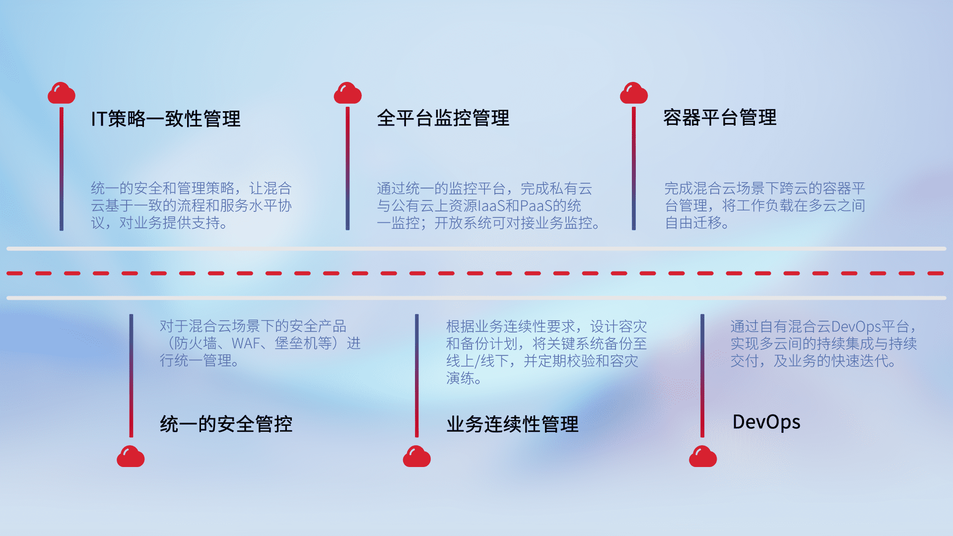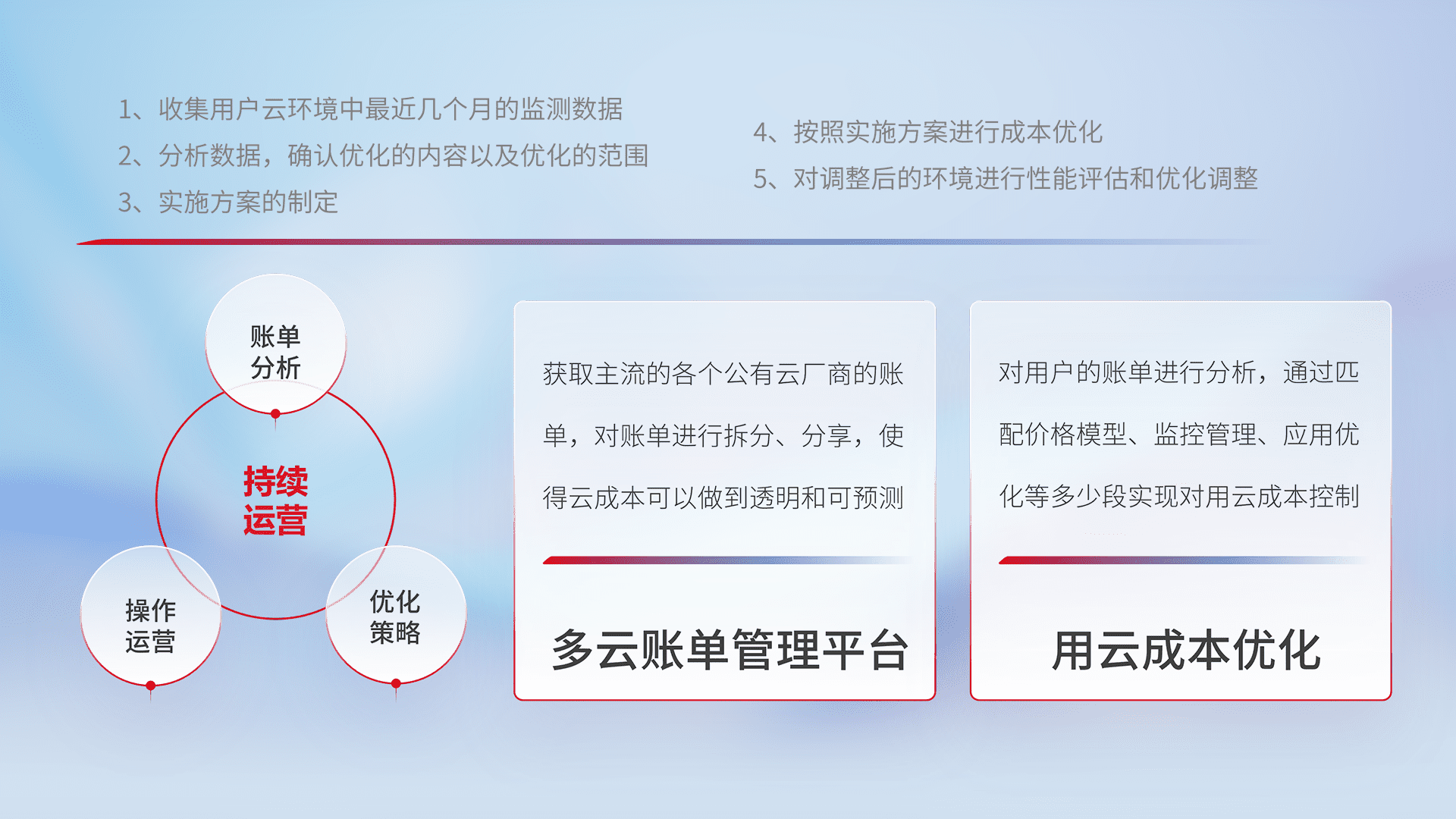 通过多云纳管,,,以统一的资源数据模型把客户的云资源进行抽象和封装,,,,进而实现对多云资源的统一操作,,保障云资源管理的可靠性、、、、稳定性与可用性。。。。量身定制化运维内容,,,配置、、开发运维、、、、补丁管理、、、、备份、、监控、、、、认证和访问管理、、、审计和日常巡检等,,,保障在用云过程中的可靠度,,,,稳定度以及高可用率。。。。