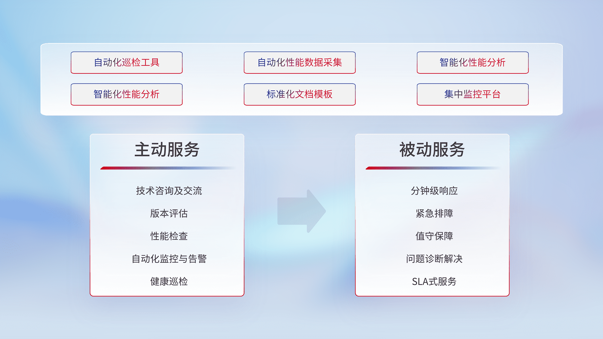 智能化工具和标准化文档,,,,保障服务质量,,提供主动服务(包含技术咨询、、版本评估、、、、性能检查、、、自动化监控与告警、、、健康巡检)和被动服务包含(分钟级响应、、、、紧急排障、、值守保障、、、、问题诊断解决、、、SLA服务)。。。。